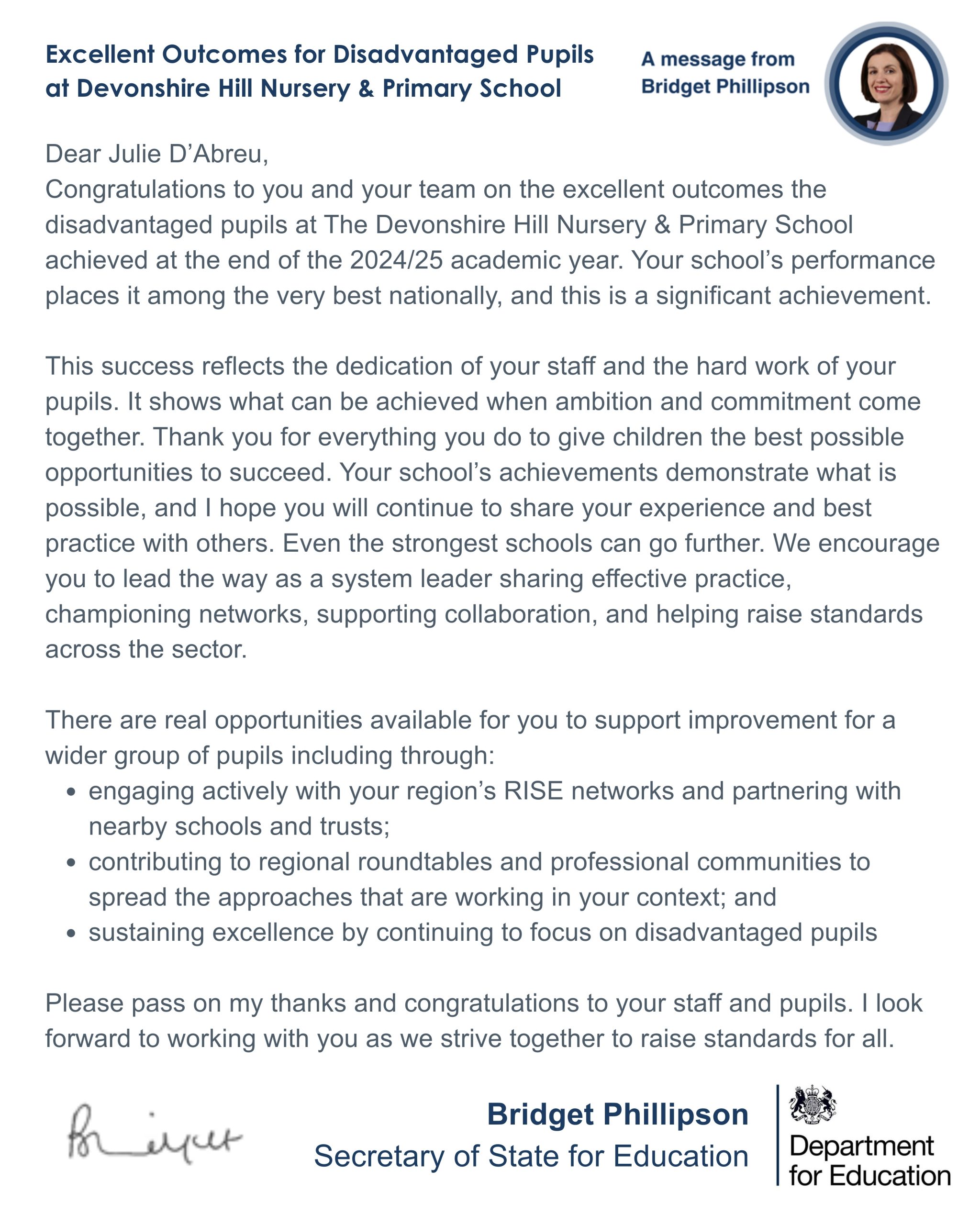 Excellent Outcomes for Disadvantaged PupilsCongratulations from the State of Secretary for Education.