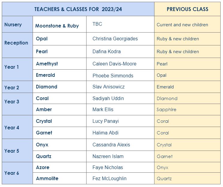 Please refer to the table below for the full teacher/class list.